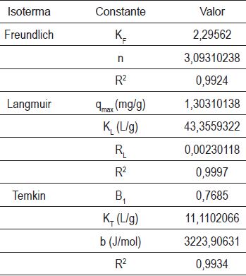 En la Tabla 2 se reportan los valores de los parámetros calculados para las isotermas de los modelos de Freundlich, Langmuir y Temkin. El valor R menor que 1 indica que el proceso de adsorción fue favorable, al igual que el valor de n superior a 1. La isoterma de Langmuir es la que más describe la adsorción del naranja de metilo en el adsorbente ctm (R2=0,9997), lo que sugiere que se caracteriza por una adsorción homogénea (monocapa) y su capacidad fue calculada en 1,3031 mg/g por el ajuste del modelo, el cual es un valor no despreciable si se considera la naturaleza azóica del compuesto [19].