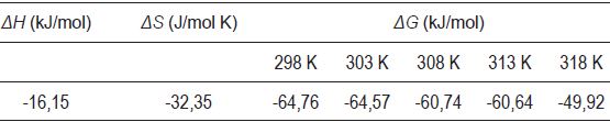 Los valores de ΔH, ΔS y ΔG se muestran en la Tabla 3. El valor negativo del cambio de entalpía (ΔH) muestra que este proceso de adsorción efectivamente es exotérmico. El valor negativo del cambio de entropía (ΔS) refleja una disminución en la aleatoriedad en la interfase adsorbente/solución durante el proceso. Los valores del cambio en la energía libre de Gibbs (ΔG) son negativos, lo cual indica que el proceso de adsorción ocurre espontáneamente. Los valores de ΔG aumentan con incremento en la temperatura, lo que sugiere que el proceso de adsorción es menos espontáneo a altas temperaturas.