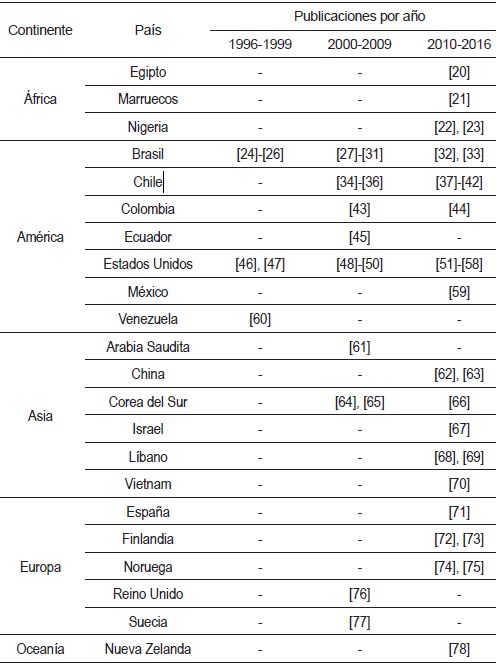 Debido a la practicidad de la metodología y el estudio cualitativo que facilita, el tipo de publicación más común ha sido el caso de estudio. En la Tabla 1 se muestran las publicaciones de esta índole incluidas en la revisión, clasificadas por país y año.