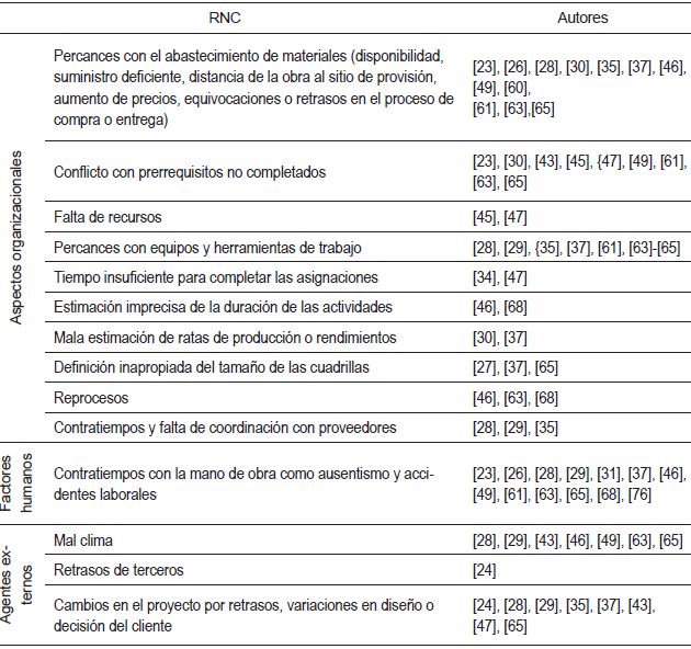 Se pueden clasificar en dos grandes grupos según su origen: agentes internos y agentes externos (véase la Tabla 2). Los primeros corresponden a aspectos organizacionales y factores humanos controlables por el personal que administra la obra; los segundos son aquellos ajenos al control de la organización. Se observó que en las primeras semanas de aplicación, el porcentaje de las rnc asociadas con agentes internos es mayor que el relacionado con agentes externos; estos últimos incrementan su participación con el tiempo, en tanto que los primeros disminuyen, lo cual evidencia un mejor control de la administración [35]-[37].