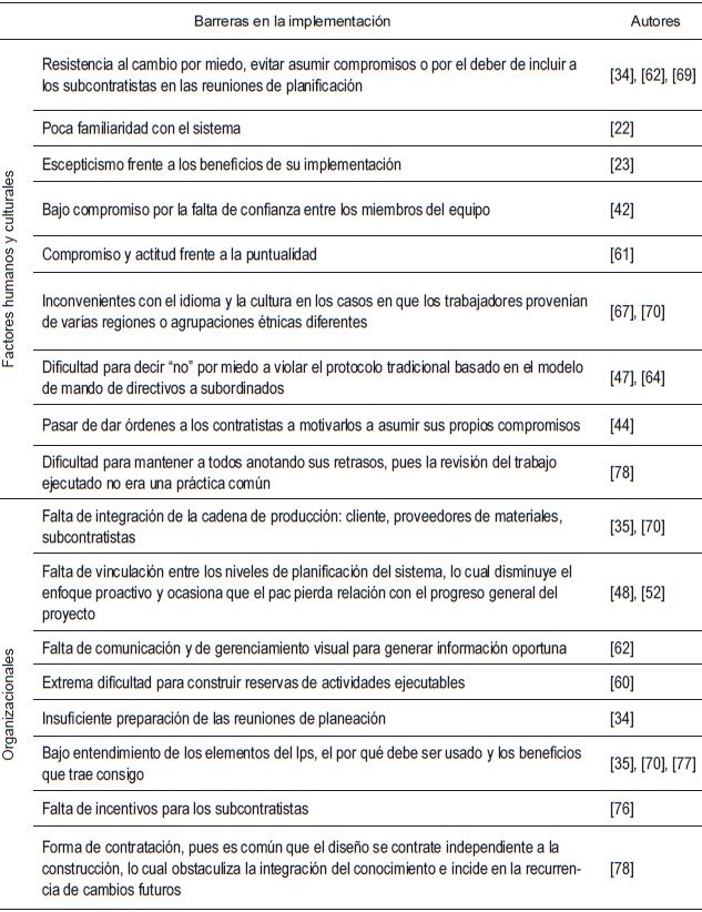 De lo anterior se llegó a diversas conclusiones, y se traen a colación algunas de ellas. Se destacó el hecho de que la deficiencia en los sistemas de planeación se debe a la falta de instrucciones y a la falta de aplicación de un proceso estandarizado [48]. A fin de que la herramienta se convierta en una práctica predominante, la gente debe tener el conocimiento del qué y el porqué del sistema, saber cómo actuar y, lo más importante, la voluntad y el deseo de hacerlo [73]. Por tanto, en la fase de adopción se necesita un liderazgo constante, comprometido y positivo; una vez se haya interiorizado y estandarizado su uso, debe haber motivación y retroalimentación repetitiva [72]. Asimismo, se destacó la importancia del análisis de restricciones, puesto que permite identificar los aspectos que limitan la ejecución de las actividades [71]; igualmente, el análisis de la causa raíz de las RNC, puesto que si esta no se examina es difícil prevenir su recurrencia [52], [57]. Se destacó también el hecho de que el lps no es solo un sistema para la planificación y el control de la producción, sino también un facilitador y promotor del intercambio social [51], [67]. También se resaltó, con base en la perspectiva de acción lingüística (LAP) [33], la importancia de asegurar el mutuo entendimiento y la coordinación efectiva dentro de la red de compromisos en la organización, y la presencia del efecto de amplificación (bullwhip effect) de las conversaciones, la propagación y la distorsión progresiva de las conversaciones en los subprocesos del LPS, lo cual deteriora el desempeño del proyecto [39]-[41].