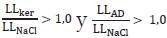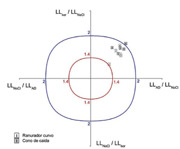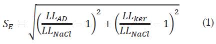 En donde, gráficamente, SE es la distancia desde el origen (LLker/ LLNaCl = 1,0, LLAD/ LLNaCl = 1,0) al punto dibujado. Las relaciones de LL deben haberse corregido previamente [1]. Si alguna de las relaciones anteriores de LL da menor que 1,0 se debe reemplazar en la Ecuación 1 por el recíproco de las relaciones y el punto se graficará en el cuadrante opuesto.