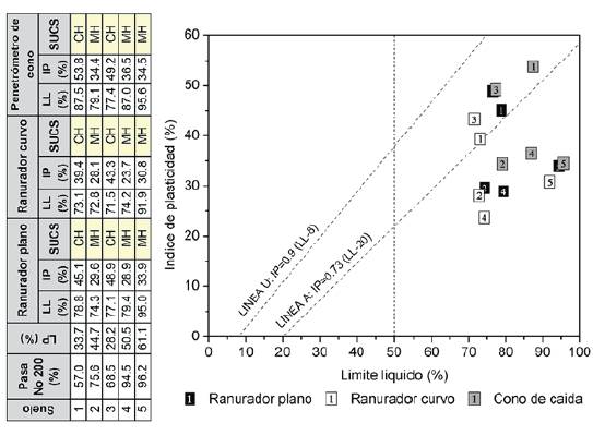 Por otra parte, para la determinación del LP se realizaron dos determinaciones a cada muestra por el método del rollo y cinco determinaciones por el método de penetrómetro de cono.