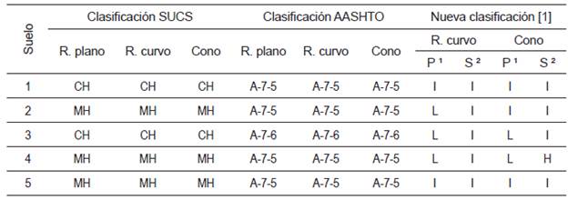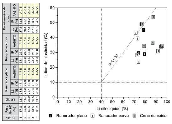 Al realizar la clasificación de los cinco suelos con AASHTO, al igual que con SUCS, no se presentó variación en la clasificación entre los tres métodos para determinar el LL. De acuerdo con esta clasificación, los suelos estarían dominados por arcillas plásticas a muy plásticas, susceptibles a cambios volumétricos.