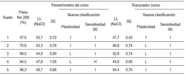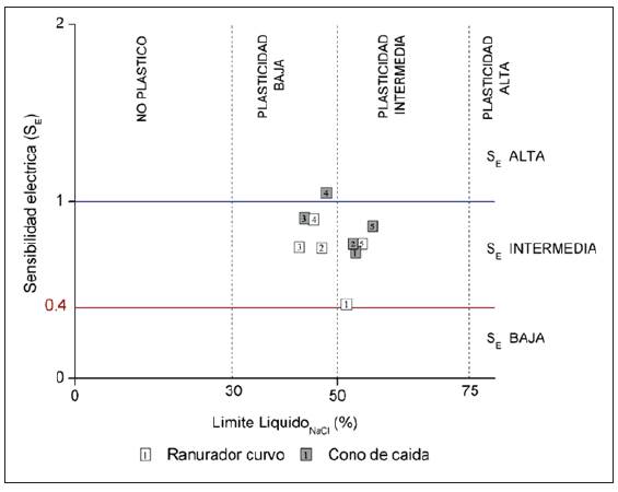 Con la nueva clasificación de suelos finos y de acuerdo con los resultados de LL determinados con el PdC, los suelos 1, 2 y 5 tienen una plasticidad y sensibilidad eléctrica (SE) intermedia (I-I), el suelo 3 tiene una baja plasticidad y SE intermedia (L-I), mientras que el suelo 4 es de baja plasticidad y SE alta (L-H). En general, la sensibilidad eléctrica indica la sensibilidad que tiene el suelo a generar propiedades de plasticidad, potencial expansivo, aumento en el intercambio catiónico, floculación e inestabilidad volumétrica. Se logra a partir del cambio de propiedades del fluido de poro tales como la concentración de iones disponibles y la capacidad de polarización de las moléculas, lo cual se ve reflejado en cambios en los efectos doble capa difusa y fuerzas de vdW.