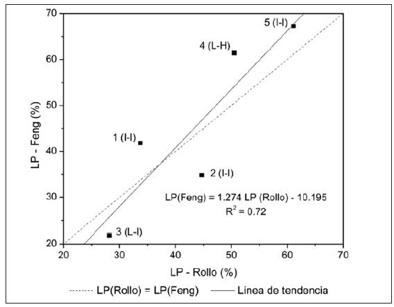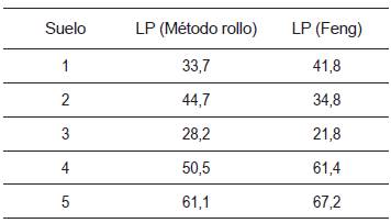 En la Figura 5 se graficó el LP estimado para cada suelo por los dos métodos. Cabe destacar que tan solo se determinaron cinco puntos, lo cual dificulta establecer una correlación lineal confiable entre ambos métodos. Lo que se puede apreciar es que la tendencia podría ser lineal hacia la línea LP (Rollo) = LP (Feng). Para este caso es imposible aceptar o descartar una relación entre ambos métodos, pero sí se podría investigar aún más a fin de estar en capacidad de estimar el LP de un suelo mediante una prueba más confiable, reproducible y objetiva que el método del rollo.