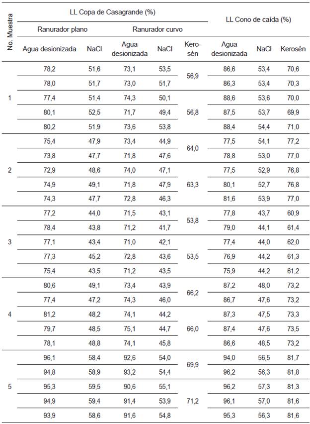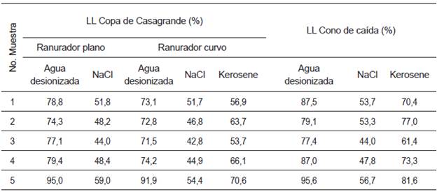 La Tabla 2 presenta los resultados de todos los LL determinados para cada una de las cinco muestras de suelo con cada tipo de fluido de poro, y en la Tabla 3 su resumen.