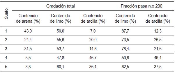 Por otra parte, se puede notar que los suelos MH (suelos 2, 4 y 5) tienen los mayores porcentajes de contenido de arcilla mientras que los CH (suelos 1 y 3) tienen los porcentajes de arcilla más bajos. Lo anterior podría deberse a: (a) no todas las partículas cuyo tamaño es menor a 2 pm son minerales de arcilla; (b) el porcentaje de arcilla a menudo se ha relacionado con la actividad de un suelo, pero se debe estudiar en conjunto con la mineralogía de dicho contenido; (c) los ensayos se realizaron con muestras que se secaron previamente, en algunos casos a temperatura ambiente (p. ej., determinación de LL), y en otros, secadas al horno a una alta temperatura (p. ej., granulometría e hidrómetro). Algunos autores [19]-[21] mencionan que hay cambios en la fracción fina del suelo si se producen cambios de temperatura en procesos de secado.