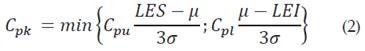 Una vez se alcanza la estabilidad estadística de los datos históricos del proceso, se realizan los cálculos del índice de capacidad a largo plazo y hacia dónde se ubica el desplazamiento de los datos con respecto a los límites de especificación mediante las siguientes formulas [3]: