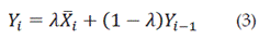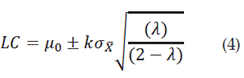 Se escogió la carta de control promedio móvil ponderado exponencialmente en este estudio (exponentially weighted moving average, EWMA por sus siglas en inglés), debido a su capacidad de detectar pequeños desplazamientos en la media del proceso. Aunque el uso del gráfico sea más comúnmente hecho con observaciones individuales, este puede también emplearse para medias al graficarse valores del estadístico Yi ; por tanto, tenemos: