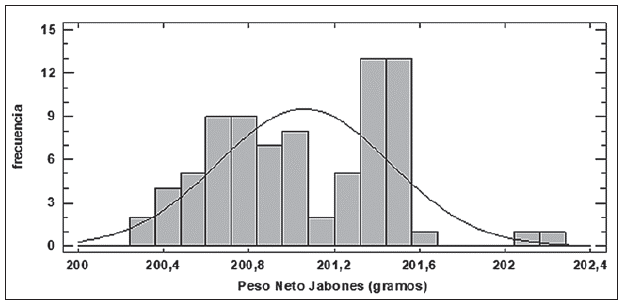 A través de la prueba de normalidad realizada (Kolmogorov-Smirnov), obsérvese en la Figura 1 una tendencia normal de los datos, lo cual se soporta con la obtención de un valor-P mayor a 0,05, por lo que no se puede rechazar la idea de que el peso neto de los jabones proviene de una distribución normal con 95 % de confianza.