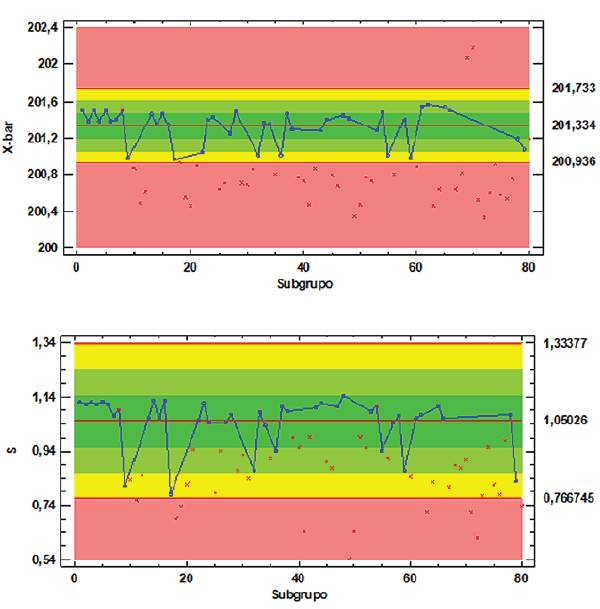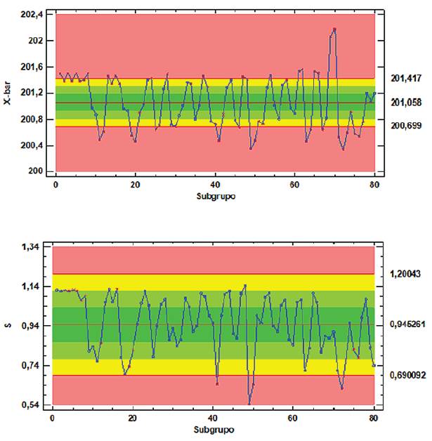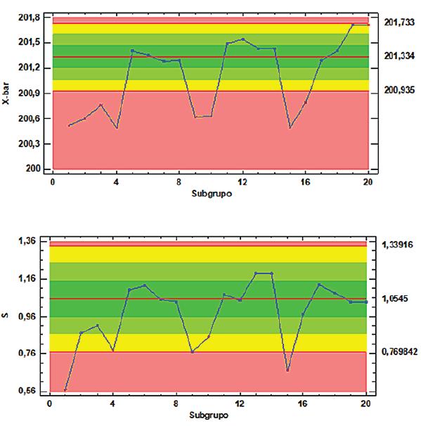 Los gráficos de control se construyen bajo el supuesto de que los datos provienen de una distribución normal con una media del proceso igual a 201,334 gramos y sigma del proceso igual a 1,05 gramos. En la Figura 5 se observa el gráfico de control X-bar - S para peso neto del jabón a controlar. De los subgrupos mostrados en el gráfico X-bar, ocho están fuera de los límites de control, mientras que en el gráfico S, dos se encuentran fuera de los límites de control.