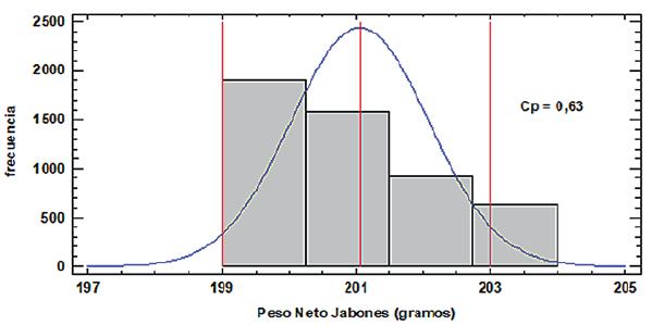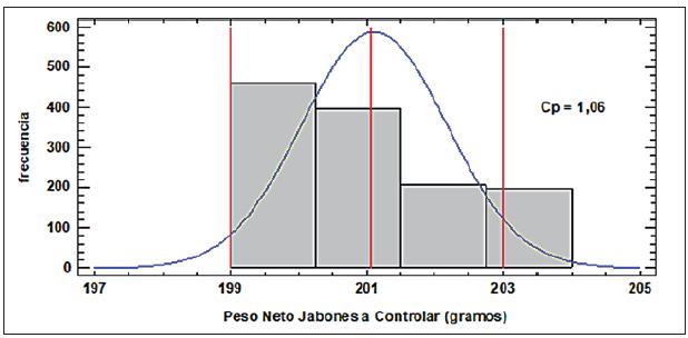 El parámetro k corresponde a un valor de 1,96 para límites de tolerancia bilaterales cuando se muestran distribuciones normales, con una confiabilidad del 95 % y una potencia del 90 % para 5040 observaciones. Por tanto, el límite superior e inferior de especificación tiene valor de 203 y 199 gramos, respectivamente.