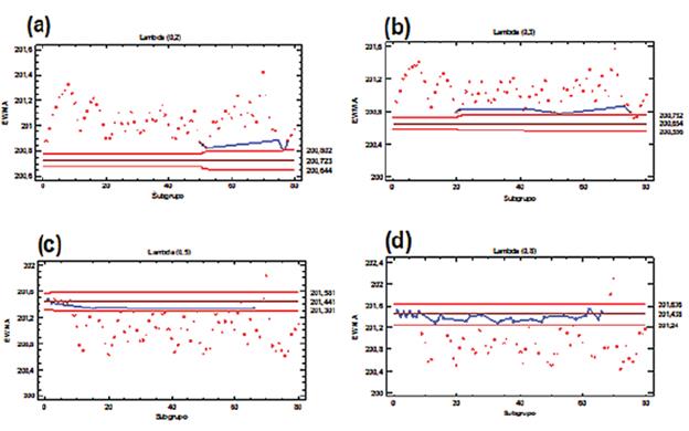 Para bajos valores de λ, el gráfico detecta pequeños desajustes con mayor rapidez, lo que hace que los datos históricos tengan peso grande en el cálculo de Yi, e, inversamente, valores altos de λ hacen que la última observación tenga mayor peso en el calculo de Yi [10].
