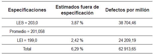 En la Tabla 1 podemos observar los valores de límites de "Especificación" (superior e inferior), "Estimados fuera de especificación" y "Defectos por millón", a través de los cuales se calculan los costos de no calidad. Para aquellos defectos menores (24 209,19 DPM) que el límite de especificación inferior, tienen incidencia negativa en las expectativas del cliente con respecto al producto. En cuanto a los defectos mayores (38 704,46 DPM) que el límite de especificación superior, representan una pérdida de 127 700 COP por cada millón de unidades fabricadas.