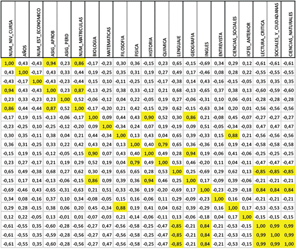 Un primer ejercicio consistió en generar la matriz de coeficientes de correlación de Pearson, con el fin de identificar la existencia de variables correlacionadas y el grado de correlación entre las mismas. Este coeficiente mide el grado o magnitud de la relación entre diferentes variables, partiendo del supuesto de que existe una relación lineal entre las mismas. El valor del coeficiente varía entre -1 y 1. La magnitud de la relación está dada por el valor absoluto, mientras que el signo refleja la dirección de la relación. En este sentido, un valor de 1 representa una relación perfecta positiva, que indica que la relación entre las variables es fuerte y directa, es decir que, al aumentar el valor de una variable, la otra también aumenta en forma proporcional. De la misma forma, un valor de -1 representa una relación perfecta negativa, lo cual indica que la relación es fuerte e indirecta. Un valor de 0 indicaría que no existe relación entre las variables involucradas, y los valores intermedios indicarían una relación fuerte o débil de acuerdo con su cercanía con los extremos, -1 o 1 [10]. Una vez generada la matriz de coeficientes, se encontró que las únicas correlaciones fuertes que se aprecian son entre el número de niveles cursados, el número de asignaturas aprobadas y el número de matrículas, relación que en principio parece obvia. Por otro lado, se evidencia que en el caso de la edad, el estrato socioeconómico y el número de asignaturas pérdidas no presentan una relación fuerte con las demás variables analizadas. Los valores obtenidos se muestran en la figura 2.