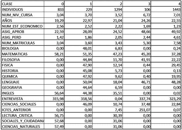 Uno de los parámetros de entrada del algoritmo k-means es el número de grupos en los que se quiere agrupar la población total. Resulta común que el algoritmo se ejecute tres o cuatro veces para tres, cuatro o cinco grupos [11]. En este caso, el algoritmo fue ejecutado para 5 grupos y se obtuvo la siguiente distribución: grupo 0, conformado por 833 individuos (21 %), correspondiente a estudiantes en promedio de 19 años y tres semestres cursados; grupo 1 conformado por 229 individuos (6 %), correspondiente a estudiantes en promedio de 23 años y cuatro semestres cursados; grupo 2, conformado por 1294 individuos (33 %), correspondiente a estudiantes en promedio de 21 años y tres semestres cursados; grupo 3, conformado por 106 individuos (3 %), correspondiente a estudiantes en promedio de 24 años y cinco semestres cursados; y grupo 4, conformado por 1443 individuos (37 %), correspondiente a estudiantes en promedio de 23 años y ocho semestres cursados. Este último grupo podría considerarse como el de mejor desempeño, dada la consistencia entre la edad y en nivel académico. Al realizar este agrupamiento se obtiene los centroides de cada uno de los grupos, los cuales proporcionan información acerca de los valores medios para cada una de las variables correspondientes a cada individuo que fue asignado a determinado grupo. Se realizaron pruebas adicionales que generaron 4 grupos, y se obtuvieron resultados similares.