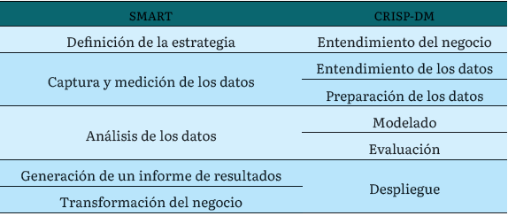 Basados en la propuesta de [8], en el proceso de big data se consideraron las cinco etapas contempladas en la metodología SMART: definición de la estrategia; captura y medición de los datos; análisis de los datos; generación de un informe de resultados y transformación del negocio. Estas fases guardan correspondencia con las definidas en las metodologías clásicas de la minería de datos. A manera de ilustración, en la tabla 1 se muestra la equivalencia de cada una de las fases de la metodología SMART con la metodología CRISP-DM: