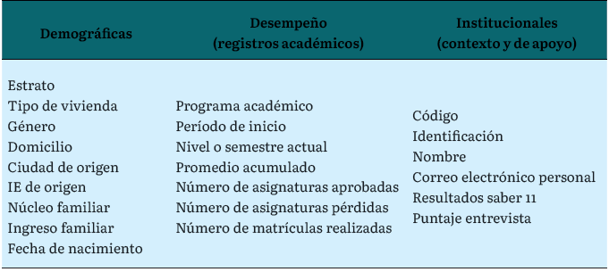 De esta forma, y de acuerdo con la revisión de las fuentes, se escogieron 21 variables correspondientes a la información tanto académica como socioeconómica de cada estudiante matriculado.