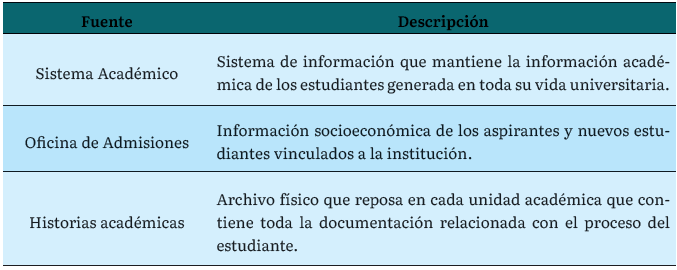 Fuentes por utilizar. Identificadas y caracterizadas las fuentes de datos, se procede a definir la fuente de información a utilizar para cada una de las variables propuestas. De las 21 variables seleccionadas, se establece el Sistema Académico para 11 de ellas, y la Oficina de admisiones para las 10 restantes, como se relaciona a continuación. Oficina de Admisiones: Estrato, Tipo de vivienda, Género, Domicilio, Ciudad de origen, IE de origen, Núcleo Familiar, Resultados saber 11 y Puntaje entrevista. Sistema Académico: Fecha de nacimiento, Programa académico, Periodo de Inicio, Nivel o semestre actual, Promedio acumulado, Número de asignaturas aprobadas, Número de asignaturas perdidas, Número de matrículas realizadas, Código, Identificación, Nombre y Correo personal.