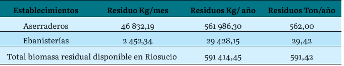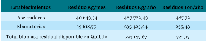 De acuerdo con nuestra investigación, se puede decir que existe una cantidad considerable de empresas que transforman la madera en estos dos municipios (109), las cuales generan un alto volumen de biomasa residual, (723,15 ton/año en Quibdó y 591,42 ton/año de residuos en Riosucio). Este volumen puede aumentar si se cuantifican los residuos que quedan en el bosque luego de la extracción de madera. Además, pudimos corroborar que el alto volumen de estos residuos se debe a que las empresas que transforman la madera emplean maquinaria en mal estado, realizan los procesos de forma artesanal y emplean a personas con un conocimiento limitado de aspectos logísticos de manejo y gestión de los residuos.