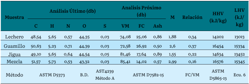 En este estudio analizamos tres especies de interés comercial para la región: Lechero (Brosimum utile (Hunth) Oken), Guamillo (Inga sp) y Jigua (Ocotea cernua). Adicionalmente, analizamos una cuarta muestra compuesta por la mezcla de estas especies en cantidades iguales. En la tabla 3 se resumen los valores obtenidos de los análisis último y próximo de las muestras de madera.