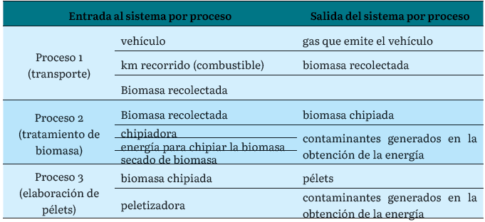 El ACV de las dos tecnologías nos arrojó resultados similares, ya que las dos tienen el mismo aprovisionamiento. Los datos de entrada y de salida del sistema para la elaboración de pélets se describen en la tabla 4 y para la generación de energía en la tabla 5.