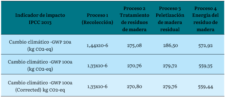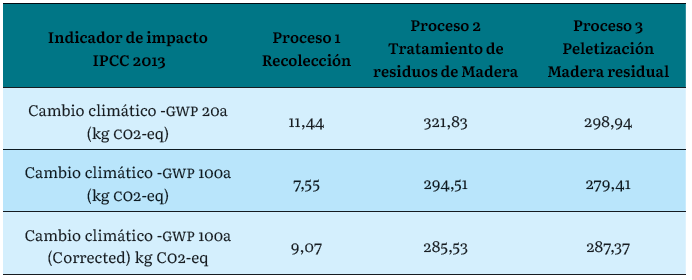 Para la Evaluación del Impacto de Ciclo de Vida (EICV), utilizamos la base de datos Ecoinvent 3.3 con los indicadores de impacto del IPCC 2013, que corresponden a las contribuciones al potencial de calentamiento global (GWP) para 20 y 100 años. Como se puede observar en la tabla 8, las contribuciones al GWP 20 son mayores por su corto horizonte temporal en relación con las de GWP 100. También se pude observar que los procesos 2 y 3 son los que más contribuyen al calentamiento global, debido a que consumen energía para el chipiado de la madera y la generación de pélets.