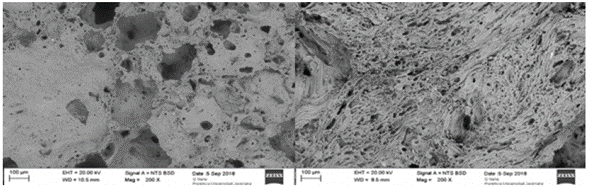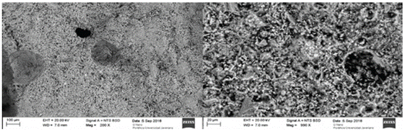 Con el análisis realizado en el microscopio electrónico de barrido (SEM) se pudo comprobar la microestructura de cada una de las muestras, en donde se observó a detalle la composición, topografía, alteraciones o deformaciones y señales particulares de las muestras. Además, este permite realizar un análisis químico mediante espectroscopia por dispersión de energía (EDS). A continuación se presentan algunas de las imágenes obtenidas a 100, 200 y 1000 aumentos, así como el espectro resultante del análisis químico.