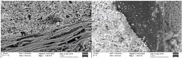 Las muestras sometidas al análisis de microscopia electrónica de barrido, nos permitieron conocer la microestructura de los agregados (figura10), en donde se evidenció la alta porosidad de estos. Vale la pena resaltar que la piedra pómez presenta una estructura con un mayor número de poros y un tamaño menor a los 20um; esto se logró comprobar con la ayuda del software de procesamiento de imágenes "ImageJ", el cual permite hacer una medición del diámetro de los poros. La figura 11 corresponde a la microestructura del concreto ligero, la cual muestra una estructura compacta con poros diminutos (<10 um) y una buena adherencia de los agregados. La microestructura del concreto con adición de fibras y humo de sílice (figura 12) se observa claramente la adherencia con los agregados en este caso la piedra pómez, al igual que con las fibras de polipropileno, las cuales tienen un diámetro aproximado de 154 um (0,154 mm).