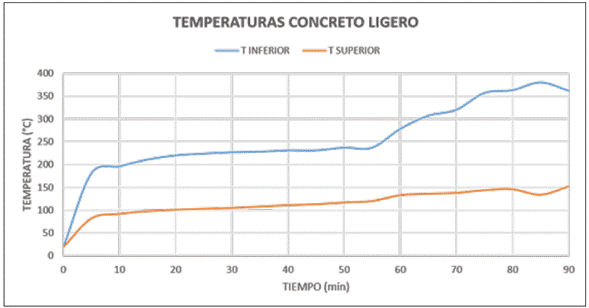 Las temperaturas registradas permiten observar que el mortero patrón tuvo una transferencia del 42 % respecto a la temperatura inferior, la cual está expuesta al fuego. La figura 14 muestra una tendencia a mantener la misma transferencia de calor a través del tiempo, lo que se refleja en la equidistancia entre las curvas de temperatura. Por su parte, la placa de mortero convencional registró una transferencia de calor del 62 %, lo cual corrobora la eficiencia del concreto ligero como aislante térmico.