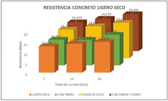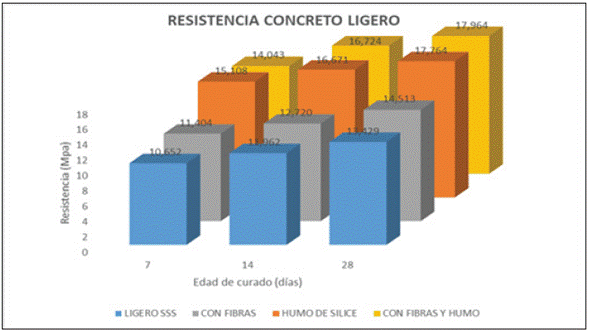La resistencia a la compresión mide la calidad de las mezclas desarrolladas en el proyecto de manera neta, rápida y eficaz; determinando un margen de seguridad estructural. Los resultados obtenidos muestran un aumento gradual de la resistencia, lo cual es el comportamiento típico de un concreto. La adición de fibras y humo de sílice representaron un aumento del 33 % para el caso del concreto ligero con agregados en estado saturado y de un 20 % para el concreto ligero con agregados en estado natural; este comportamiento se debe principalmente a la adición de humo de sílice, pues las fibras le proporcionan una mayor adherencia al momento de presentarse una falla. Se evidenció además que el uso del agregado en estado natural obtuvo una resistencia superior al concreto con agregado saturado, cerca de 15 %. Sin embargo, esto genera un aumento considerable en la relación a/c de la mezcla, que si bien no afecta la resistencia, sí lo hace con la consistencia, y se obtiene un concreto más fluido y difícil de manejar, pues si bien el material presenta una alta absorción, no se sabe con certeza la velocidad de absorción, ya que los ensayos se realizan saturando el agregado durante 24 horas.