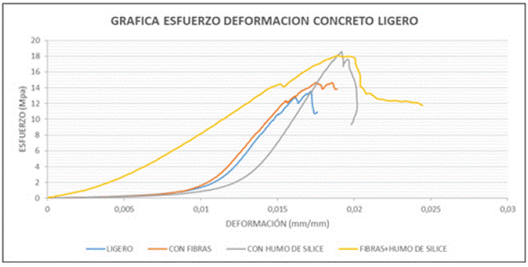 Los diagramas de esfuerzo deformación permiten analizar las propiedades del concreto como la tenacidad, ductilidad y módulo de elasticidad. Se dice que un material frágil es aquel que llega a la rotura sin mucha deformación; en estructuras, un material frágil no es deseable, ya que tiene roturas sin previo aviso, llegando al colapso de forma inmediata; mientras que un material dúctil es aquel que al llegar a la rotura ha sufrido grandes deformaciones [33]. Con base en lo anterior es posible afirmar que el concreto ligero muestra un comportamiento frágil, pues registra poca deformación y su falla es súbita. Por otro lado, el módulo de elasticidad se define como la pendiente que forma la línea recta de la zona elástica [34], por lo que la mezcla de concreto ligero con adición de fibras y humo de sílice tiene un módulo de elasticidad mayor, por ende, posee una mayor rigidez.