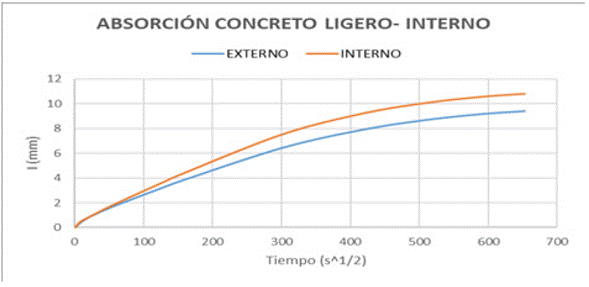 El ensayo de tasa de absorción de agua del concreto, nos brinda indicador de la interconexión existente entre los poros que conforman el concreto, ya que el garantizar un flujo ascendente obliga al agua a atravesar los poros o cavidades que contenga la muestra. La figura 8 muestra el comportamiento de la tasa de absorción del concreto ligero, en donde se observa una baja absorción inicial (parte lineal), mientras que la absorción secundaria resultó ser mayor. Además, se evidencia una mayor absorción de la muestra interna del concreto; esto se debe a que allí quedan expuestos los agregados y estos contribuyen al aumento en la absorción. La tasa de absorción máxima registrada fue de 10,82 mm, y para un mortero convencional se obtuvo una absorción interna de 11,51 mm, lo cual nos indica que el concreto ligero es un material cuya baja densidad se debe principalmente a la ligereza de sus agregados, ya que en su estructura no registra alta porosidad y no posee redes de poros interconectados [37].