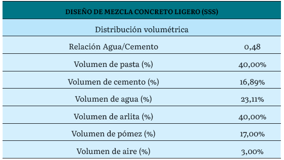 Para el diseño de mezcla del concreto ligero se evaluaron inicialmente los métodos de diseño del American Concrete Institute (ACI 211) y otro siguiendo las recomendaciones de la Norma Técnica Colombiana (NTC), de los cuales se determinó que el mejor diseño para un concreto convencional de 21 Mpa fue el método NTC; sin embargo, al momento de realizar el diseño del concreto ligero se encontraron los siguientes problemas: la densidad de los agregados es menor de 1000 Kg/m3, razón por la cual no funciona esta metodología, y la absorción de los agregados llega hasta el 70 % para el caso de la pómez, por lo que se planteó utilizar los agregados en estado saturado y superficialmente seco (SSS) con el fin de evitar el ajuste de corrección por absorción en el diseño.
