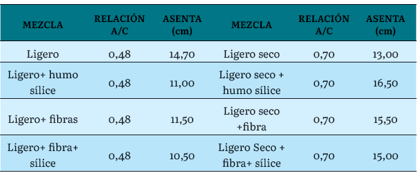 Los ensayos específicos como la absorción, densidad de equilibrio, aislamiento térmico y acústico se realizaron únicamente con la mezcla de concreto ligero, mientras que la compresión de cilindros, asentamiento y densidad en estado endurecido se realizaron para todas las mezclas de concreto ligero con/sin adiciones (tabla 3).