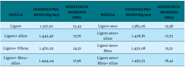 Las mezclas de concreto ligero con arcilla expandida y piedra pómez en estado seco presentan mejores características físico-mecánicas que las mezclas realizadas con estos agregados en estado saturado y superficialmente seco. La adición de fibras de polipropileno y humo de sílice aumentan la densidad promedio de la mezcla de un 5 a 8 %, con el beneficio en el incremento de la resistencia media de hasta un 30 %.