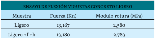 Para determinar la resistencia a la flexión se elaboraron dos viguetas: una de concreto ligero sin ninguna adición y otra con adición de fibras y humo de sílice, las cuales se fallaron a 28 días, por el método de la viga cargada en el centro. Con los resultados obtenidos se calculó el módulo de rotura para cada mezcla.