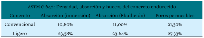 Cuando se quiere conocer la porosidad de un material existen varios métodos para encontrarla; sin embargo, este método resulta más fácil de ejecutar, ya que no requiere equipos complejos de laboratorio. De los resultados se evidencia que el concreto ligero posee una alta absorción respecto a un mortero convencional, y aunque posee un mayor porcentaje de poros permeables, la absorción después de la ebullición no aumentó considerablemente, lo cual nos indica que existe una baja interconexión entre los poros existentes en la matriz del concreto.
