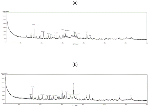 En la figura 1, se presenta la composición mineralógica de las escorias. Se presentaron fases cristalinas como Sulfato de sodio (Na2S2O8), wustita (FeO), magnetita (Fe3O4), sulfato de sodio (Na2SO4), magnetita alta (Fe2.929O4), carbonato de sodio (Na2CO3), disodiotiosulfato pentahidratado (Na2S2O3(H2O)5), thenardita (Na2SO4), cuarzo alto (SiO2). La composición mineralógica es similar a lo encontrado por Andrade et al. [5], De Angelis et al. [20] y Kim et al. [21].