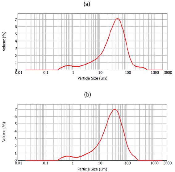 El tamaño de partícula se determinó a partir de la técnica de Granulometría Láser, MasterSizer 2000, entre un rango de 0,02 a 2000 µm. En la figura 2 se muestra la distribución de partícula en volumen (%) para las escorias. El tamaño medio de partícula para ES1 y ES2 es de 47, 613 µm y 38, 019 µm, respectivamente.