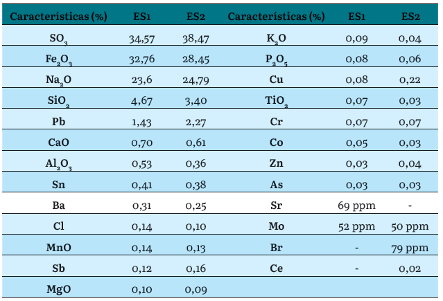 Como se observa en la tabla 1, los principales elementos son el azufre (S), hierro (Fe) y sodio (Na), que junto con sus óxidos representan aproximadamente el 90 % de las escorias. Andrade et al. [5], Smaniotto et al. [7], Gomes et al. [8] y Penpolcharo en [9] presentan composiciones químicas de escorias secundarias de plomo similares a las obtenidas en este trabajo.