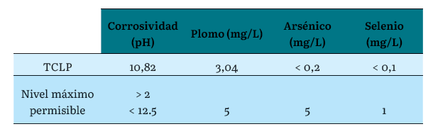 De acuerdo con los resultados obtenidos en el ensayo de lixiviación TCLP, la escoria de plomo es un residuo no peligroso, por lo cual lo convierte en un residuo con un gran potencial para ser aprovechado.