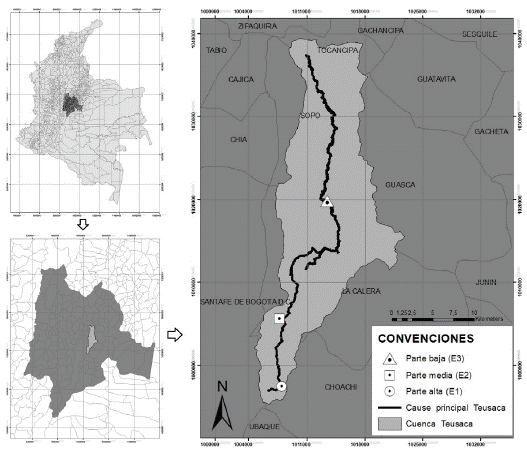 La selección de los puntos de muestreo se basó en la identificación de zonas estratégicas, con ayuda de cartografía y un recorrido previo por toda el área de la cuenca. Se escogieron tres sitios, tal y como se observa en la figura 1: la estación 1 (E1: 4°34'33.8o" N - 74° o'33.6o" O) en la parte alta en el municipio de Choachí, con una altura aproximada de 3292 m.s.n.m; la estación 2 (E2: 4°39'o.40" N - 74° o'42.6o" O) en la parte media de la cuenca, en el municipio de La Calera, con una altura aproximada de 2907 m.s.n.m., y la estación 3 (E3: 4°46'41.40" N - 73°57'35.30" O) se localizó en la parte baja, en el municipio de La Calera, con una altura aproximada de 2579 m.s.n.m.