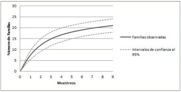 Con el fin de verificar el esfuerzo muestreal se calculó la curva de acumulación de familias, basada en el estimador no paramétrico Chao 1 y mediante el software EstimateS.