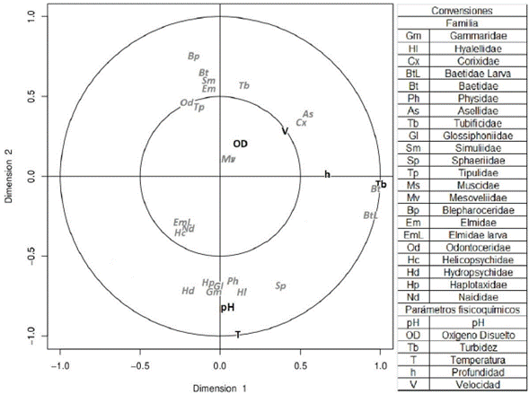 Teniendo en cuenta eso, el oxígeno disuelto y la velocidad del agua fueron los parámetros fisicoquímicos más influyentes en el desarrollo de distintas familias de macroinvertebrados acuáticos, las cuales fueron: Mesoveliidae, Tipulidae, Odontoceridae, Elmidae larvae, Naididae, y Helicopsychidae. A su vez, la familia Hyalellidae, que fue la más representativa de todo el estudio, presentó mayor afinidad con el pH y la temperatura.