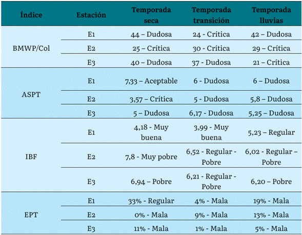 Al igual que con los índices anteriores, el índice IBF varió entre pobre (contaminación muy significativa) y regular-pobre (contaminación significativa) en las estaciones E2 y E3, en cualquier época, mientras que para la E1 durante la temporada seca y la de transición presentó una calidad del agua muy buena (contaminación ligera), debido a la presencia de la familia Simuliidae, siendo indicador de aguas poco contaminadas [30]; para la temporada de lluvias presentó una calidad del agua regular (contaminación regular).