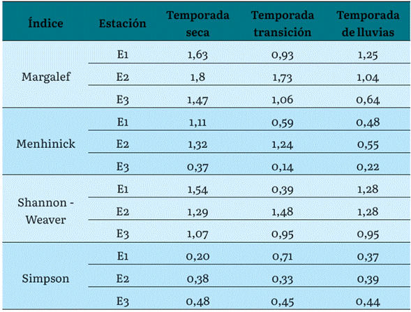 Los resultados de los índices de Margalef y Menhinick fueron muy similares en todas las estaciones a lo largo de las distintas temporadas. El índice de Margalef mostró rangos entre 0,64 y 1,80, mientras que el índice de Menhinick estuvo entre 0,14 y 1,32, interpretándose ambos resultados como baja biodiversidad en la zona.