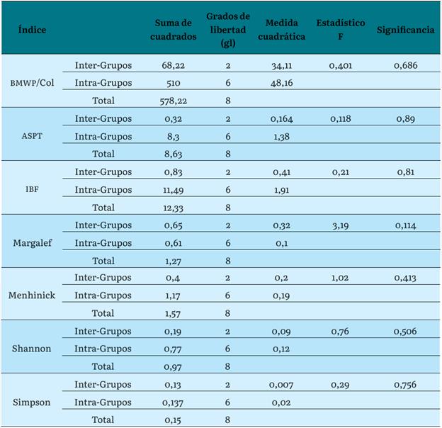 Luego de aplicar la prueba de Kolmogorov-Smirnov para confirmar que la distribución de los datos fuera normal, se realizó un Análisis de Varianza (ANOVA) con el propósito de observar si había variación significativa entre los índices y los sitios de muestreo y entre estos y las distintas temporadas. Los resultados arrojados para los índices de calidad (BMWP/Col, ASPT, e IBF) y para los índices de diversidad (Margalef, Menhinick, Shannon-Weaver, y Simpson) con respecto a la temporada arrojaron un nivel de significancia mayor a 0,05, por lo que se acepta la hipótesis nula; esto permite precisar que no existe una diferencia significativa entre diferentes épocas climáticas y el valor de los índices. Estos resultados son reflejo de los parámetros fisicoquímicos obtenidos en cada una de las estaciones de muestreo, que no varían de una manera drástica en las diferentes temporadas; además, las cualidades de los macroinvertebrados acuáticos, como lo son su amplio espectro de respuestas a las perturbaciones (que en este estudio fueron pocas) y su naturaleza sedentaria y de largos ciclos de vida en el medio acuático, en algunos casos de meses o años [20], [34], presentan una alta influencia en los resultados de este análisis estadístico.