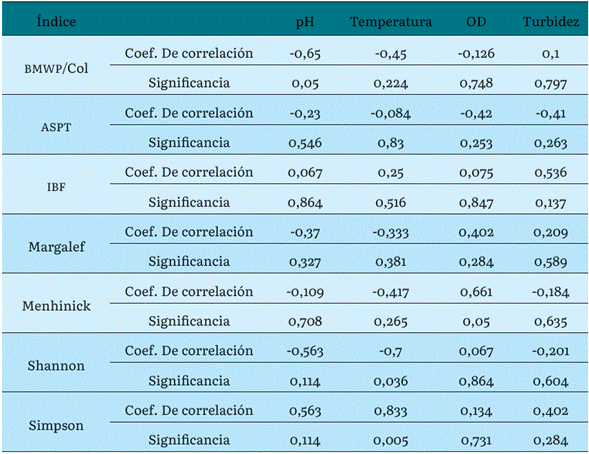 Para saber el grado de interdependencia que presentan las variables fisicoquímicas con los índices biológicos se realizó la correlación de Spearman, cuyos rangos de estos coeficientes va de -1 a +1.